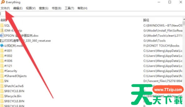 在 Everything 主界面顶部菜单栏中,点击 文件(File)选项卡。