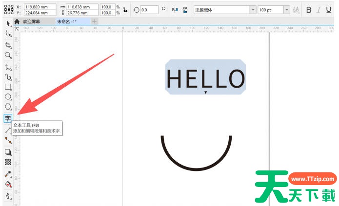 选择文本工具(F8),在画布空白处输入文字(如“HELLO”)。在属性栏中调整字体、字号及颜色等参数。