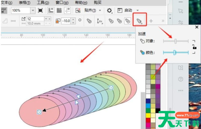 选中调和对象,点击属性栏中的 “对象和颜色加速” 按钮(图标为两个滑块)。在弹出的面板中,拖动 “颜色” 滑块调整渐变强度。