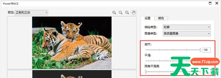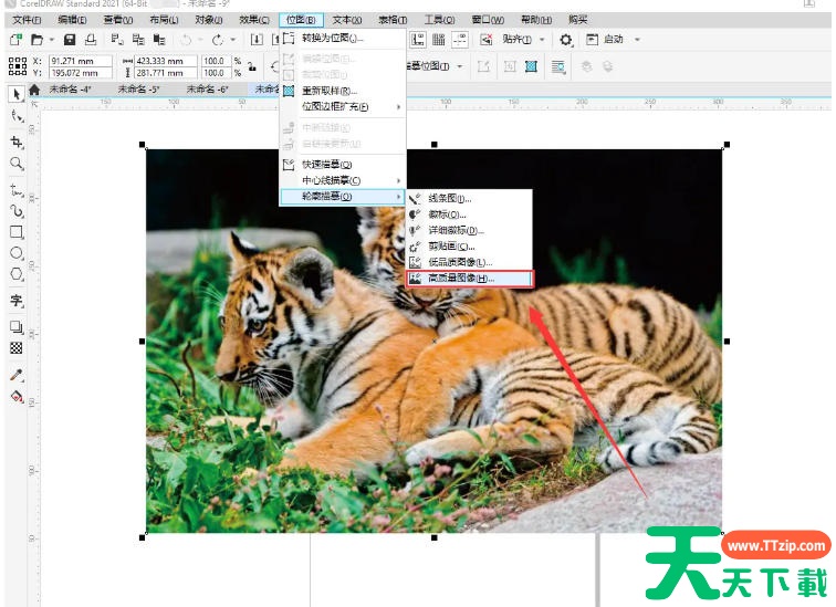 选中图片 → 点击【位图】→【轮廓描摹】→【高质量图像】。