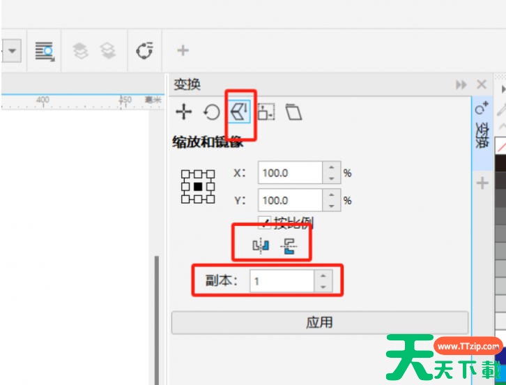在变换面板中点击缩放与镜像选项卡。