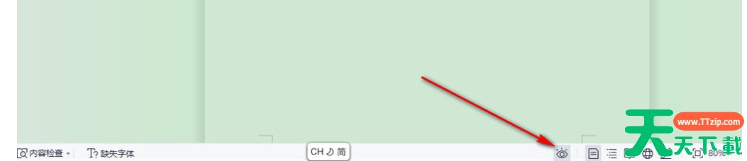 在界面底部状态栏位置有一个类似眼睛的图标,点击该图标也能关闭护眼模式,同样会使文档内容外的区域绿色消失。
