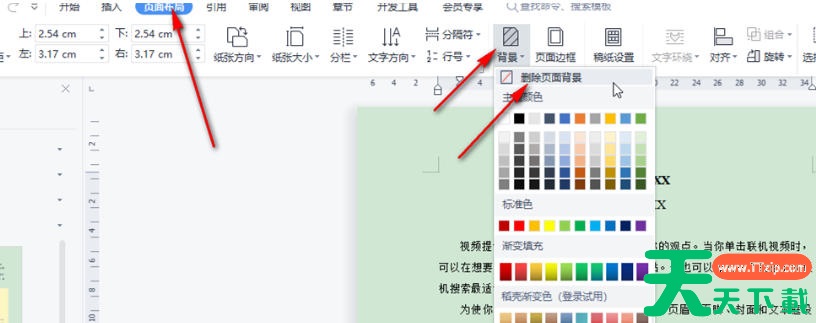 在下拉菜单中选择“删除页面背景”选项,这样文档页面内的绿色就会被成功去除,整个文档界面将恢复到正常的白色显示状态。