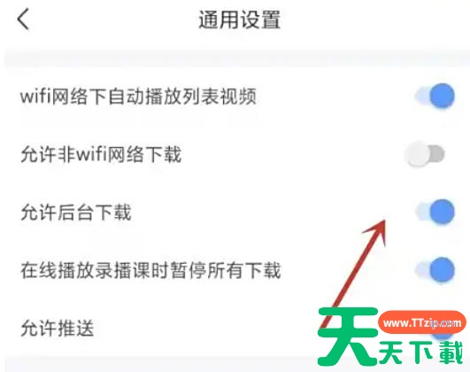 在通用设置页面中,找到“允许后台下载”选项,并点击其右侧的开关按钮,将其从关闭状态切换为开启状态。