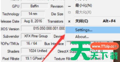 在 gpu-z 主界面顶部标题栏(显示显卡型号的位置)单击右键。在弹出的菜单中,点击 “Settings”(设置)或 “设置”(中文版)。