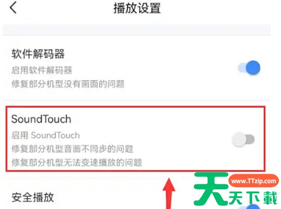 在播放设置页面中,找到“SoundTouch”选项,并点击其旁边的开启按钮(通常是一个滑动开关),将其从关闭状态切换为开启状态。