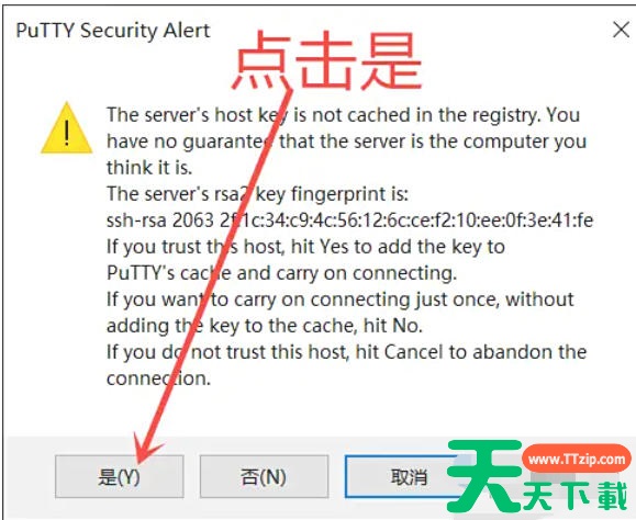 点击 Open,弹出终端窗口。首次连接会提示 “Server’s host key is not cached”,