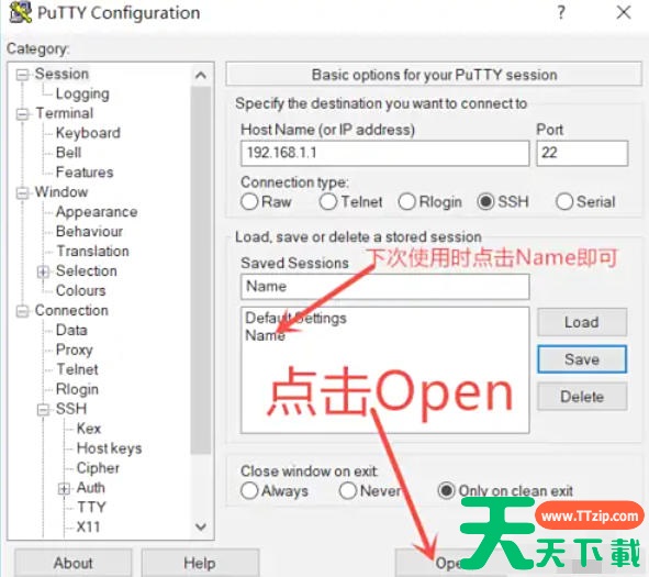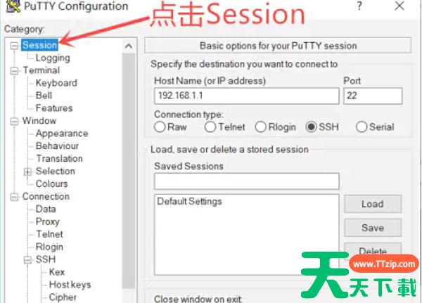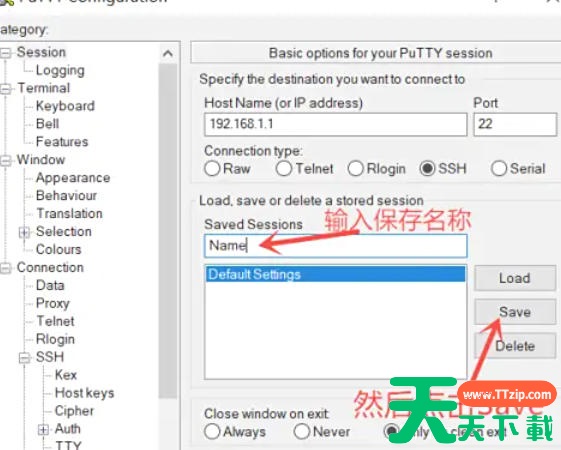 返回左侧导航栏顶部,选择 Session。在 Saved Sessions 输入会话名称(如 MyKeyServer)。点击 Save,下次可直接双击加载配置。