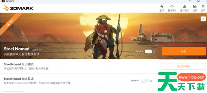 在【Benchmarks】界面选择目标测试(如Steel Nomad)。点击【Run】开始测试,全程勿触碰键盘/鼠标(避免干扰数据采集)。测试完成后自动跳转至结果页面,等待数据加载(约10-15秒)。