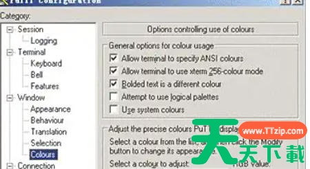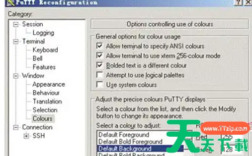 启动 PuTTY,在左侧导航栏展开:Category → Window → Colour