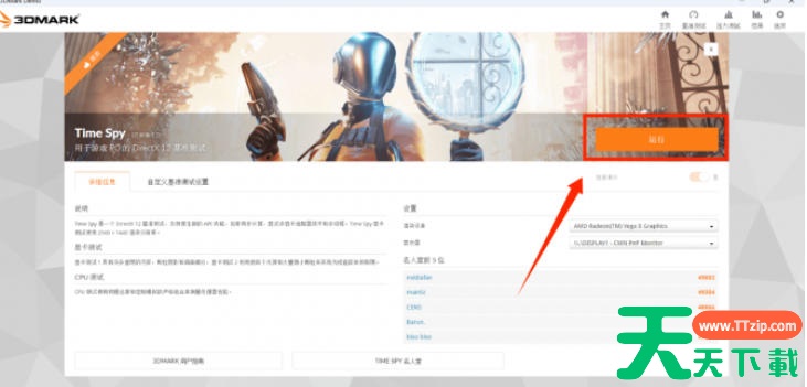 返回主界面 → 点击 【Time Spy】 右侧的 【运行】 按钮。