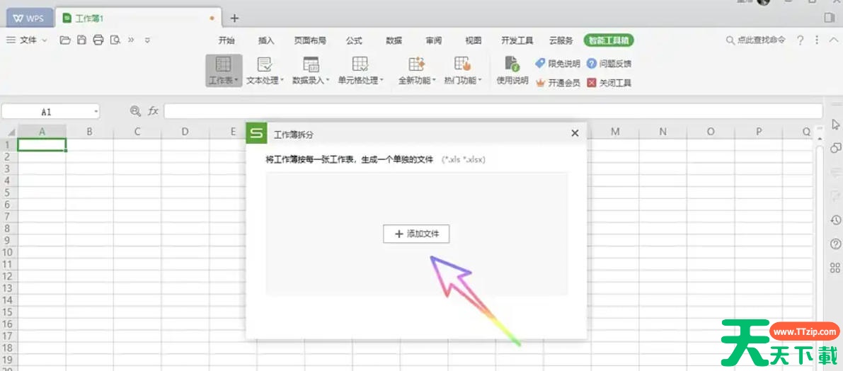 在弹出的拆分窗口中,点击页面中间的 「添加文件」 按钮。在电脑文件夹中找到目标工作簿,选中后点击 「打开」。