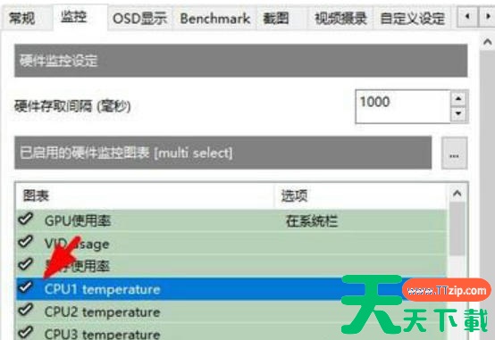3、在监控界面中,勾选想要在桌面上显示的监控项目,如显卡温度、频率、帧率等。
