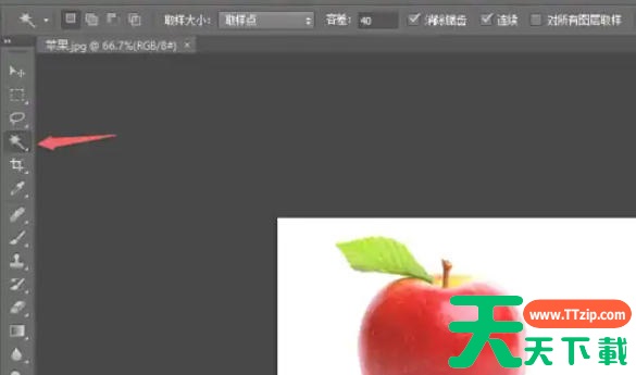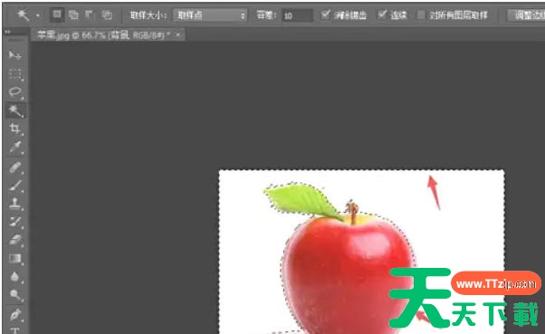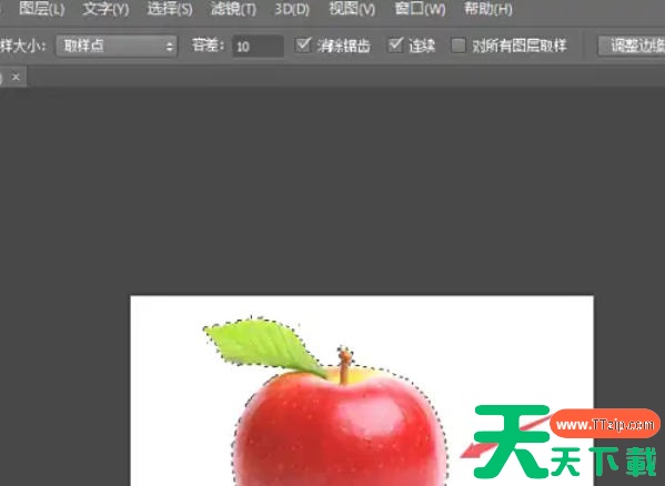 用魔棒点击苹果背景(非苹果部分),此时会选中背景区域(蚂蚁线闪烁)。