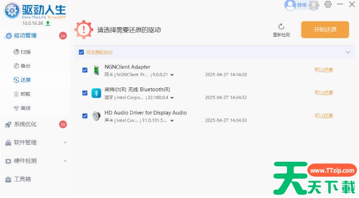 驱动人生是一款专业、易用的硬件驱动管理软件。它能够智能检测计算机中的硬件设备,并一键安装或更新所需的驱动程序,确保硬件发挥最佳性能。无论是罕见的旧设备还是最新的硬件,其庞大的驱动库都能提供广泛支持。除了核心的驱动管理功能,它还集成了硬件检测、驱动备份/还原、系统故障修复等实用工具,有效解决因驱动问题导致的蓝屏、卡顿、无法上网等电脑故障。界面简洁直观,操作简单,是普通用户和IT技术人员维护电脑驱动、保持系统稳定高效的得力助手。接下来就让天天下载Ttzip为大家解答一下驱动人生怎么进行网络测速以及驱动人生进行网络测速的方法吧!