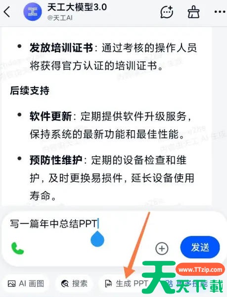 天工是一款多功能AI助手,那么天工怎么制作PPT?天工制作PPT的方法?下面就让天天下载Ttzip给大家解答下吧! 天工怎么制作PPT? 1、打开天工App,点击底部导航栏的“我的”图标,选择【天工大模型3.0】。 2、在文本框中输入PPT的核心主题,点击【生成PPT】即可。 以上就是天天下载Ttzip为您整理的天工怎么制作PPT?天工制作PPT的方法啦,希望能帮到您。 除特别注明外,本站所有文章均为 天天下载 原创,转载请注明出处来自 https://www.ttzip.com/201950.html