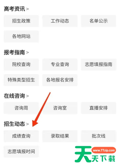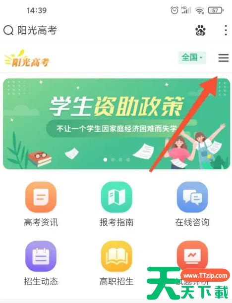 阳光高考网是一款专为高考考生提供全方位服务的智能应用,那么阳光高考怎么查历年录取分数?阳光高考查历年录取分数的方法?下面就让天天下载Ttzip给大家解答下吧! 阳光高考怎么查历年录取分数? 1、打开阳光高考软件,点击右上角的“三条横杠”图标。 2、在招生动态中,点击“成绩查询”选项即可查看成绩。 以上就是天天下载Ttzip为您整理的阳光高考怎么查历年录取分数?阳光高考查历年录取分数的方法啦,希望能帮到您。 除特别注明外,本站所有文章均为 天天下载 原创,转载请注明出处来自 https://www.ttzip.com/201967.html