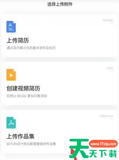 boss直聘是一款专业找工作、求职、招聘的应用手机软件,那么boss直聘怎么上传作品集?boss直聘上传作品集的方法?下面就让天天下载Ttzip给大家解答下吧! boss直聘怎么上传作品集? 1、打开boss直聘APP 确保已登录账号,进入软件主界面。 2、进入“我的”页面 点击底部导航栏中的【我的】选项,进入个人信息页面。 3、找到“附件简历”选项 在个人信息页面中,向下滑动至【附件简历】模块,点击进入。 4、选择“上传新附件” 在附件简历页面中,点击【上传新附件】功能按钮。 以上就是天天下载Ttzip为您整理的boss直聘怎么上传作品集?boss直聘上传作品集的方法啦,希望能帮到您。 除特别注明外,本站所有文章均为 天天下载 原创,转载请注明出处来自 https://www.ttzip.com/201996.html