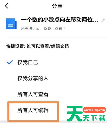腾讯文档是一款可多人协作的在线文档,那么腾讯文档怎么设置多人在线编辑?腾讯文档设置多人在线编辑的方法?下面就让天天下载Ttzip给大家解答下吧! 腾讯文档怎么设置多人在线编辑? 1、点击分享按钮 在文档右上角找到 “分享” 按钮。 2、设置权限 在弹出的分享窗口中,选择 “可编辑” 权限。 可设置链接有效期(如7天、30天或永久有效)。 若需限制访问范围,可勾选 “指定人可编辑”,并输入成员QQ/微信号。 3、复制链接或发送邀请 点击 “复制链接”,将链接发送给需要协作的成员。 或直接通过微信、QQ、邮箱等方式发送邀请。 以上就是天天下载Ttzip为您整理的腾讯文档怎么设置多人在线编辑?腾讯文档设置多人在线编辑的方法啦,希望能帮到您。 除特别注明外,本站所有文章均为 天天下载 原创,转载请注明出处来自 https://www.ttzip.com/202010.html