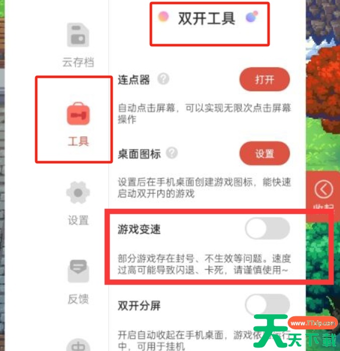 虫虫助手是一款功能全面的游戏平台,那么虫虫助手怎么设置游戏变速?虫虫助手设置游戏变速的方法?下面就让天天下载Ttzip给大家解答下吧! 虫虫助手怎么设置游戏变速? 1、在主界面下方,点击 “双开空间” 选项。 2、在双开空间界面中,找到并点击 “工具” 选项,在游戏工具列表中,找到 “游戏变速” 功能。 3、开启后,选择你想要的变速倍率即可。 以上就是天天下载Ttzip为您整理的虫虫助手怎么设置游戏变速?虫虫助手设置游戏变速的方法啦,希望能帮到您。 除特别注明外,本站所有文章均为 天天下载 原创,转载请注明出处来自 https://www.ttzip.com/202138.html