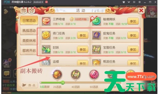 除了生活技能。剩下的就是游戏的各种副本了。游戏副本通关有金币奖励。副本中爆出的装备也可以上架到摆摊上卖。例如跑环,封妖,抓鬼,星宿副本等等