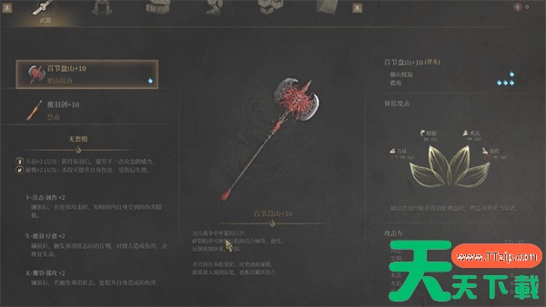 因为百节盘山跟曲鞭长刀一样,某些攻击可以变长,他的第四段轻攻击是很远的,而且也是关键的连段,打中直接回复三个须羽。才能稳定让你释放技能和法术。推图的时候可以在一定距离内开始空挥武器,然后通过变长的大斧打中敌人来回复羽毛触发神言的吸血。大斧的流派技能选择震地,不要选择怒斩,因为震地会给你一个强韧度buff,其实就是霸体,怒斩给你吸血,但是吸血在明末不算高贵的buff,神言/瞬息斩/吸血砭石都可以吸血,霸体能让你顶着boss的连段来吸血。