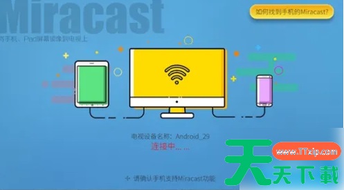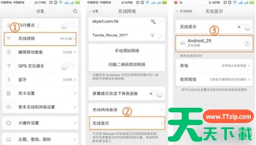 打开手机设置界面,在”无线网络->无线显示“中,选择设备名称点击即可连接。