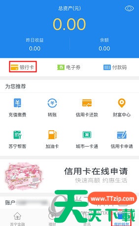 1、在“我的易购”界面汇总,点击界面右侧的“我的钱包”; 2、在“苏宁金融”界面中,点击右下角的“我的钱包”; 3、在“我的钱包”界面中,点击界面上方的“银行卡”; 4、在“我的银行卡”界面中,点击之前绑定的银行卡; 5、在“银行卡信息”界面中,点击右上角的“管理”; 6、然后下载“苏宁金融”进行银行卡的解绑即可。@天天资源网TTzip 除特别注明外,本站所有文章均为 天天下载 原创,转载请注明出处来自 https://www.ttzip.com/202381.html