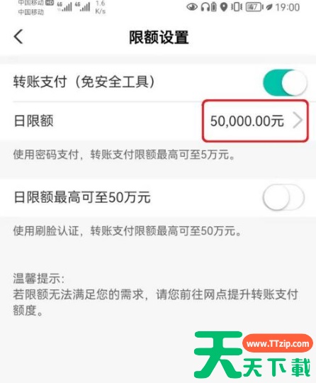 进入限额设置页面,中国农业银行根据认证方式,使用密码支付*高限额5万,使用刷脸认证*高限额50万。根据需要开启相应的认证方式后,点击【日限额】设置。