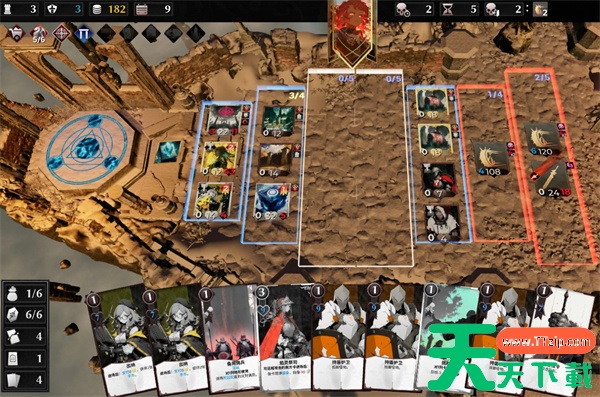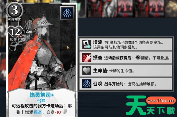 最好能打个召唤词条,可以让攻击类的单位进场就获得翻倍的伤害,如果没有召唤也不必为了振奋效果而延后攻击单位的布置,拿1张就可以了。