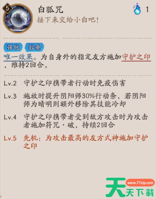 Lv.3 施放时提升阴阳师30%行动条,若阴阳师为晴明则额外移除其技能冷却