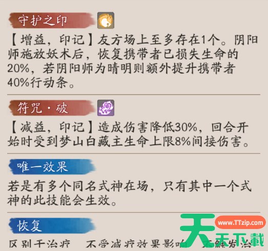 【增益,印记】友方场上至多存在1个。阴阳师施放妖术后,恢复携带者已损失生命的20%,若阴阳师为晴明则额外提升携带者40%行动条。