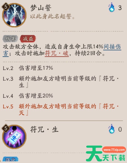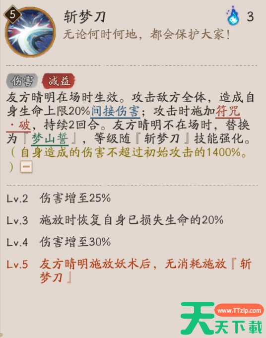友方晴明在场时生效。攻击敌方全体,造成自身生命上限20%间接伤害;攻击时施加符咒·破,持续2回合。友方晴明不在场时,替换为『梦山誓』,等级随『斩梦刀』技能强化。(自身造成的伤害不超过初始攻击的1400%。)