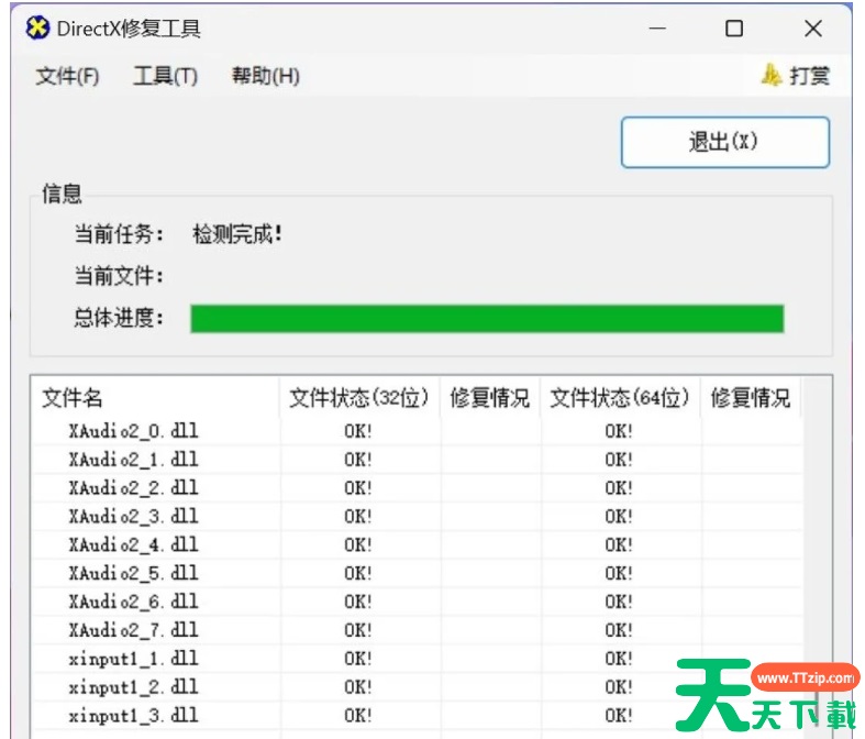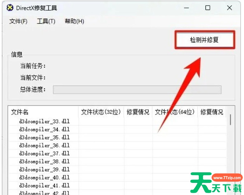 1、打开directx修复工具软件,点击主界面上的“检测并修复”按钮,程序将自动完成校验、检测、下载、修复以及注册的全部功能。