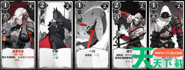 奥蕾莉亚:我方卡进场后,自身进行1次远程攻击。携带精锐和英勇(每有1点声望,加2远程攻击)词条。初始攻击不高,需要搭配辅助加伤害的卡和死囚犯铺场,才能快速养成,难度还是比较大的。