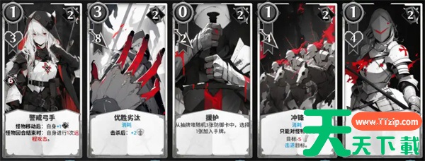 警戒弓手:怪物移动后,自身+1远程攻击,怪物回合结束时自身进行1次远程攻击。除了精锐卡以外的辅助输出角色,比起能远程攻击的防御建筑,有一定的成长性。