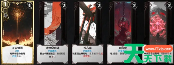 天火倾泻:8伤害攻击卡,对所有怪物使用击退目标。中期可以扭转局势的一张卡,后期能让你多拖延1到2回合,有时候拖延的这点时间,输出就能培养起来,反败为胜了。