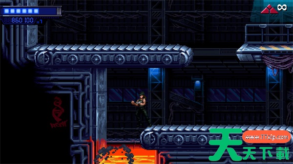 第一个检查点后,我们到达了传送带,下面有火。跳过深渊,跳进有红色涂鸦的墙里拿步枪。