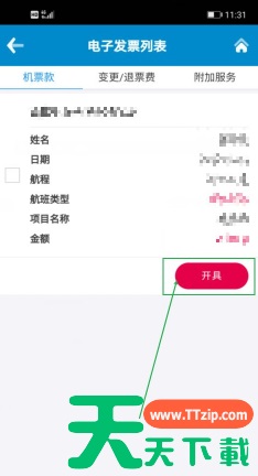 打开南方航空,如下图,看到首页,看到行程 点击行程,如下图,看到历史行程 点击历史行程,如下图,看到历史行程 点击历史行程,如下图,看到电子发票 点击电子发票,如下图,看到开具 点击开具,如下图,看到开具(勾选发票类型,输入收票人手机号码和收票人邮箱) 点击开具,如下图,看到提交 @天天资源网TTzip 除特别注明外,本站所有文章均为 天天下载 原创,转载请注明出处来自 https://www.ttzip.com/202811.html
