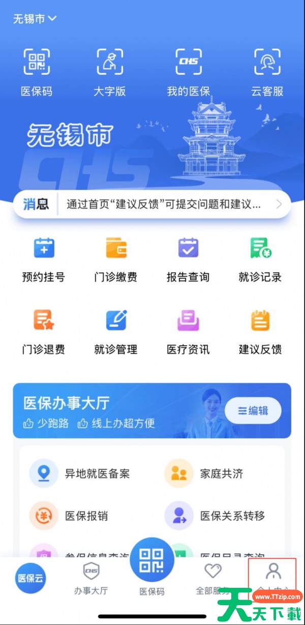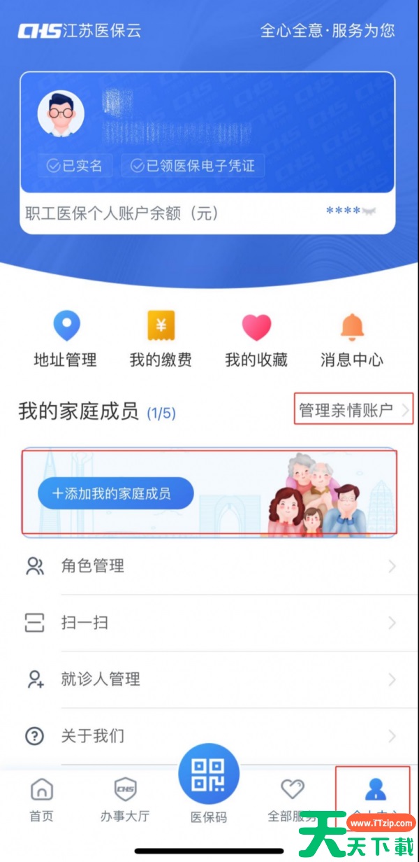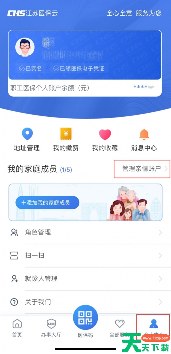 2注册并登录“江苏医保云”APP首页,点击右下角“个人中心”进入个人中心界面,点击“管理亲情账户”或点击“+添加我的家庭成员”。