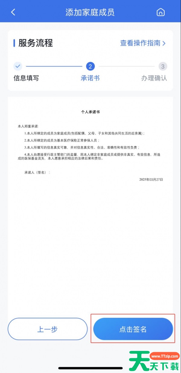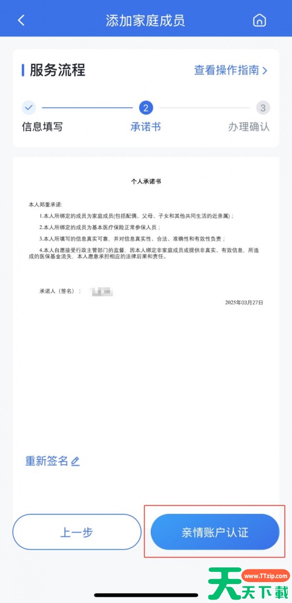 4在【承诺书】中仔细阅读承诺书内容,确认无误后签署姓名,点击【亲情账户认证】。