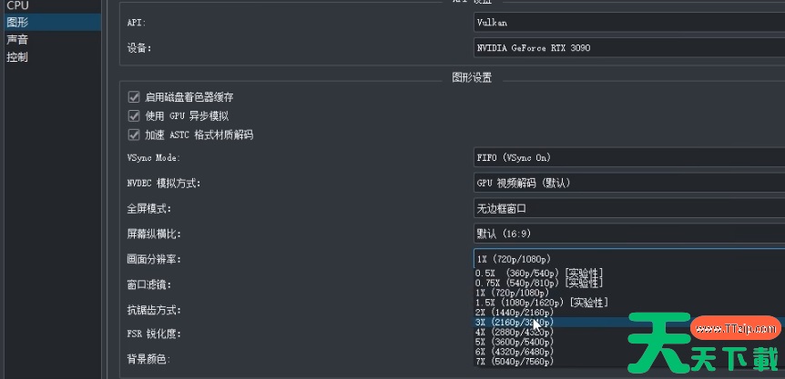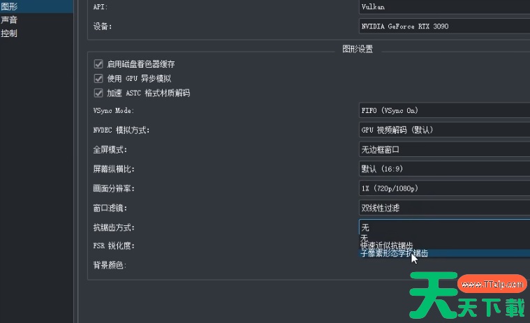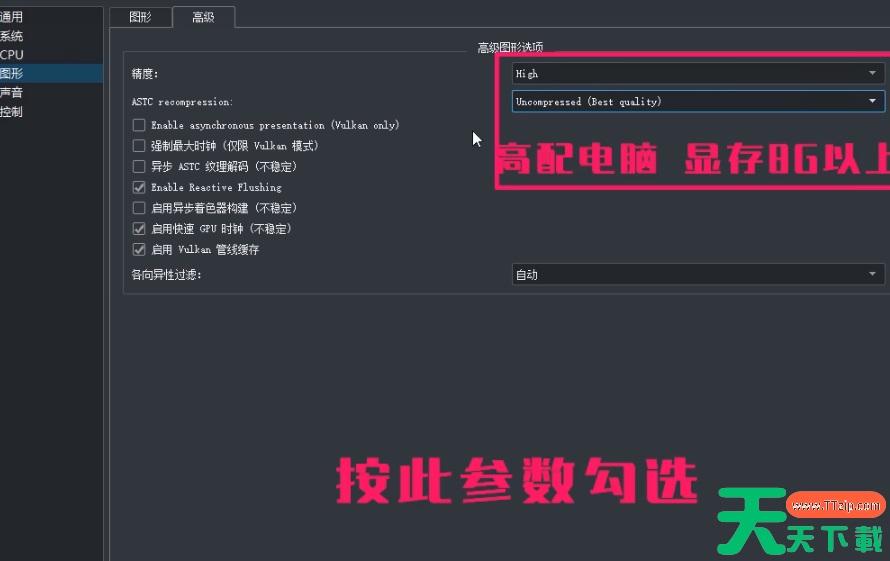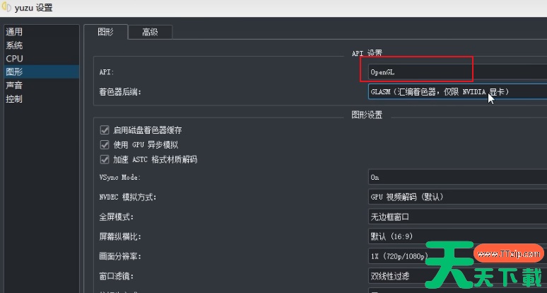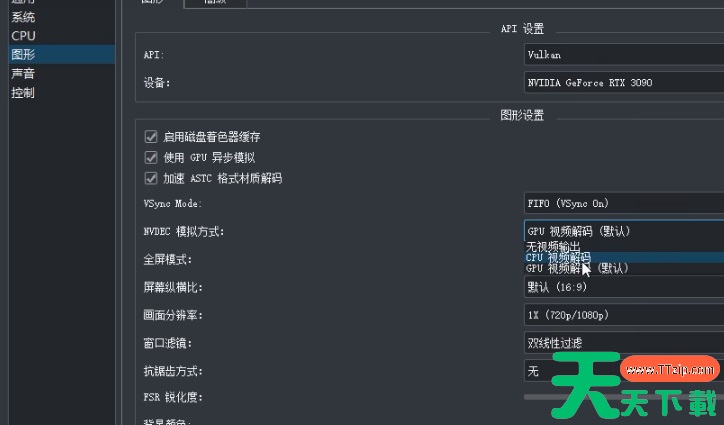 9、在图形设置中,API选项默认为Vulkan,如果游戏过程中遇到黑屏问题,可设置为OpenGL选项,没有黑屏问题就使用最快的Vulkan模式。