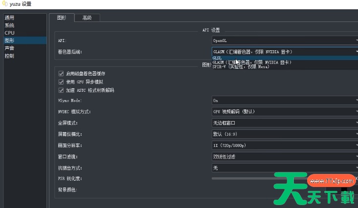 10、在图形设置中,着色器后端选择,GLASM(汇编着色器,仅限NVIDIA显卡),如果是a卡就选择GLSL模式。