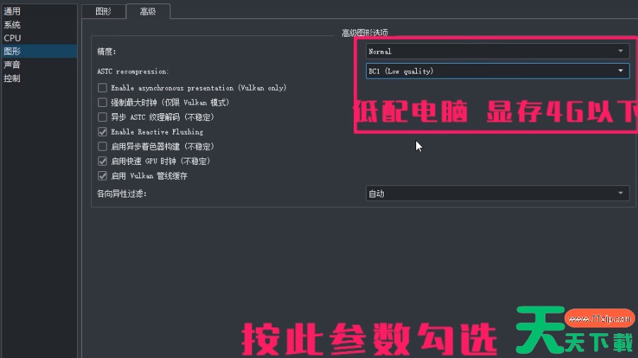 低配电脑显存4g以下选择:精度:Normal。ASTC:选择BC1(Low quality)。