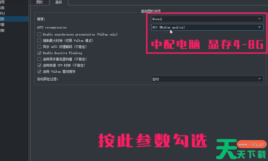 中配的显存4g-8g选择:精度:Normal。ASTC:选择BC3(Low quality)。