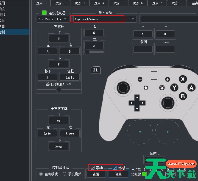 16、控制选项中,可以根据自己的需求来选择是手柄、还是键盘鼠标,如果是手柄需要勾选下方的震动和体感选项,点击右下角的ok模拟器设置完毕。