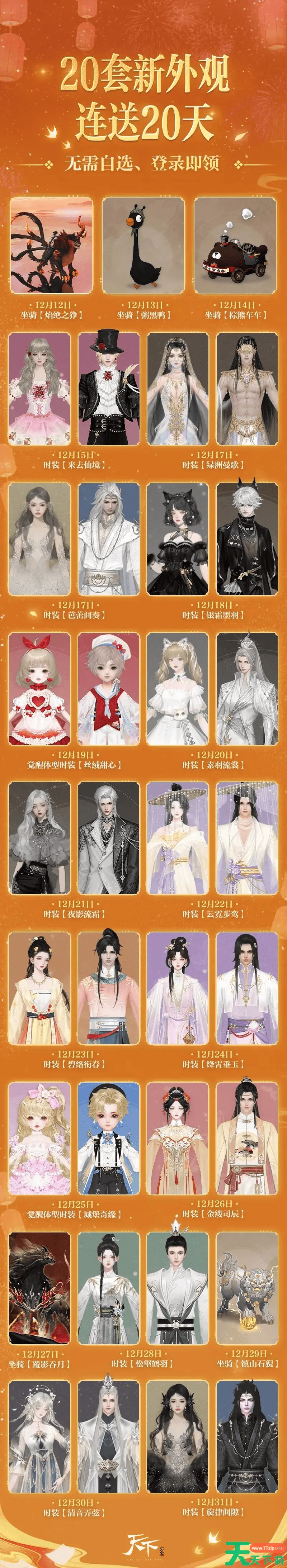 自12月12日开始持续到12月31日整整20天,少侠们每日使用《天下:万象》的PC端(现“开天”客户端)或移动端登录游戏,就能直接领取全新外观时装、坐骑、觉醒体型时装应有尽有!