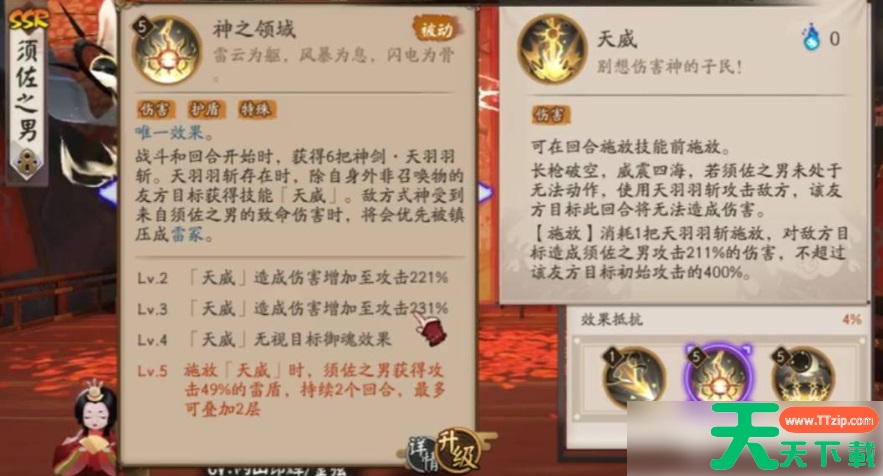 3、须佐之男技能“天威“不耗火,不耗回合,无视御魂被动。技能满级后,释放“天威“可以获得攻击力49%的雷盾,提高自身伤害。