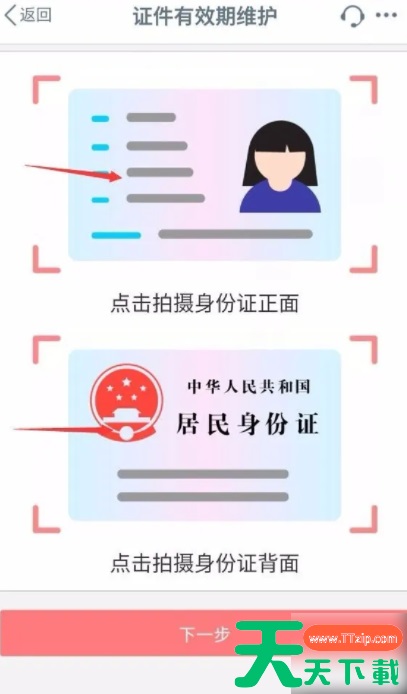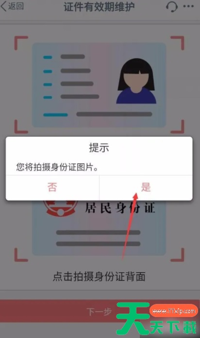 然后就会进入到证件有效期维护页面,此时我们单击“点击拍摄身份证正面“上方的图标进行拍摄身份证。
