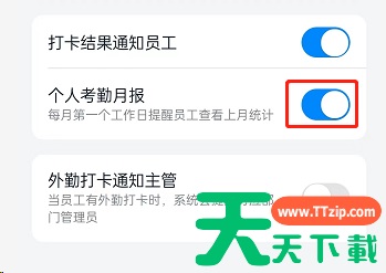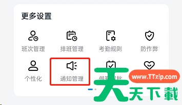 大家知道钉钉如何关闭个人考勤月报吗?下文天天下载软件站就带来了钉钉关闭个人考勤月报的方法,希望对大家能够有所帮助,一起跟着天天下载软件站来学习一下吧!钉钉如何关闭个人考勤月报?钉钉关闭个人考勤月报的方法 1、打开钉钉,点击工作台,点击考勤打卡(如图所示)。 2、点击右下角设置(如图所示)。 3、选择通知管理(如图所示)。 4、将个人考勤月报右侧开关关闭即可(如图所示)。 上面就是天天下载软件站为大家带来的钉钉如何关闭个人考勤月报的全部内容,更多手机教程尽在天天下载。@天天下载TTzip 除特别注明外,本站所有文章均为 天天下载 原创,转载请注明出处来自 https://www.ttzip.com/203184.html